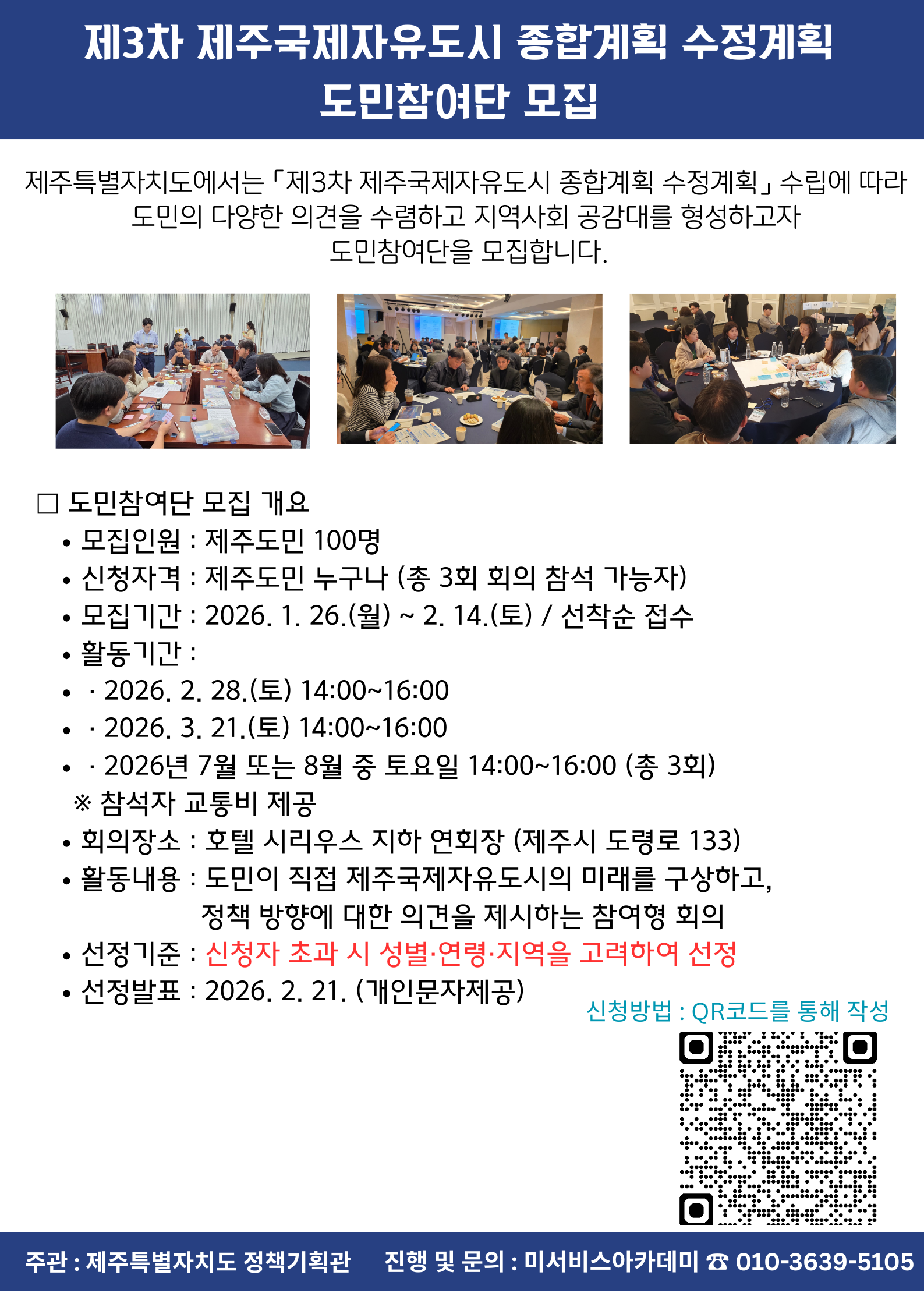 「제3차 제주국제자유도시종합계획 수정계획」 수립에 따라 도민참여단을 구성·운영하여 지역사회 공감대 제고하고자 합니다. 여러분의 적극적인 참여 바랍니다.