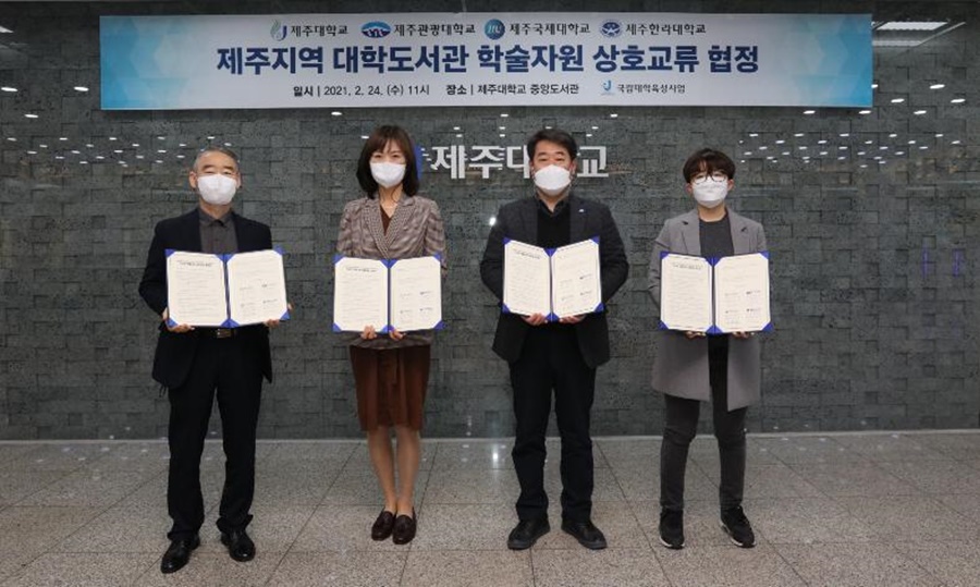 The Jeju National University Library on Friday (Feb. 26) signed an agreement for reciprocal access to academic resources with the libraries of other Jeju-based universities, including Jeju International University, Jeju Tourism University, and Cheju Halla University.