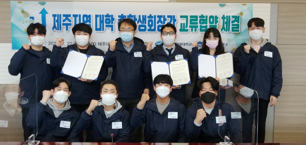 Jeju National University Student Body (Hyun Kyung Joon, President) has signed the tripartite agreement with Cheju Halla University (Chung Kong Jin, President) and Jeju Tourism University (Lee Yoon Hee, President) for exchange program aimed at regional development last Moday (February 22, 2021).