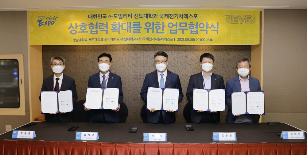 The representatives of Jeju National University and three other leading universities met with the leader of the International Electric Vehicle Expo (IEVE) to sign an agreement for cooperation early on Wednesday (Sept. 8).