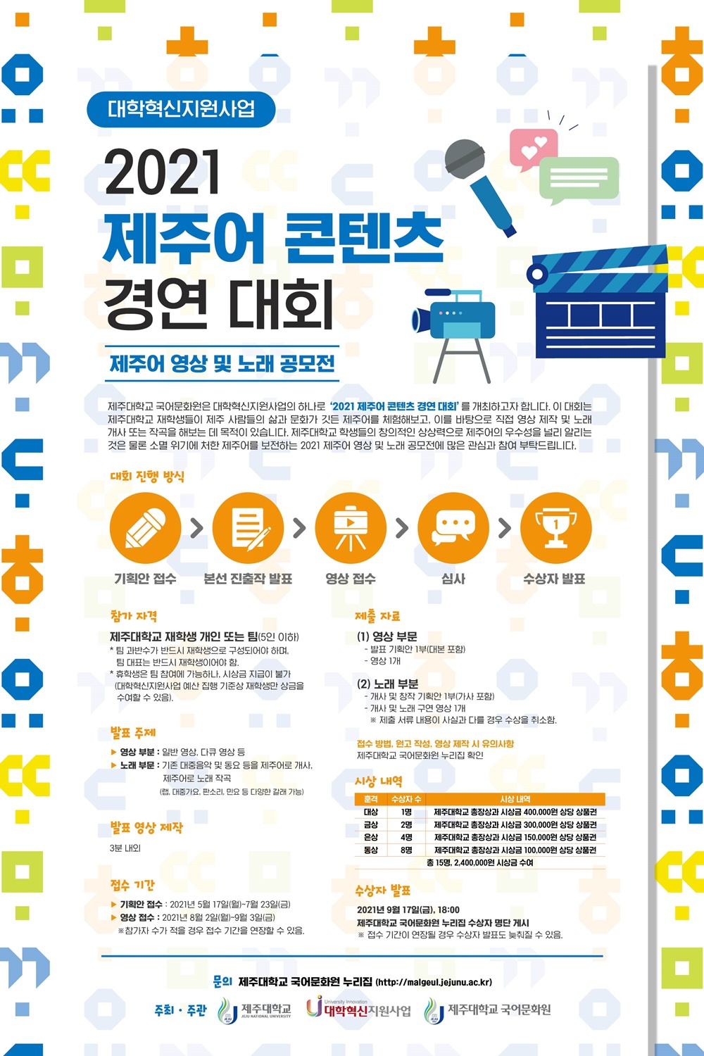 The juries will select 15 winners, including 1 Grand Prize winner, 2 winners for the Gold Prize, 4 winners of the Silver Prize, 8 winners of the Bronze Prize, with an additional winner of the Jeju National University Presidential. The winners will be awarded the prize money (gift certificates) worth 2.4 million won in total.