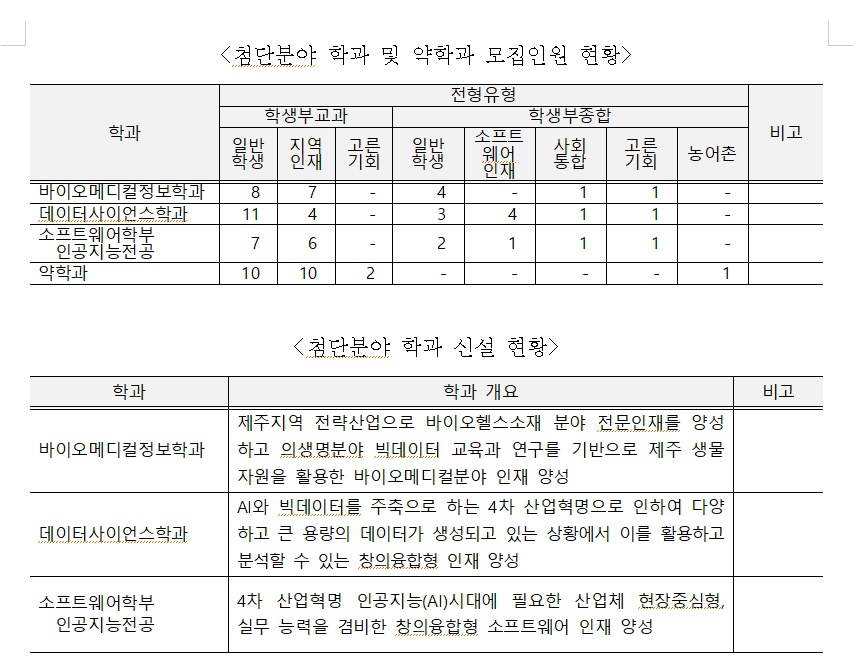To fulfill the responsibility of the flagship national university, Jeju National University established the category of “Student Records by Subject (Balanced Opportunity)” for applicants for the School of Medicine and the Department of Pharmaceutical Sciences. On top of that, a total of 334 students will be allowed for admission using the category of Student Records by Subject (Local Talent), which applies to those who are graduating from high schools located in Jeju, up 63 people from last year.
