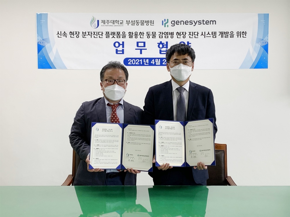 Jeju National University Veterinary Teaching Hospital and Genesystem agreed to develop a fast diagnostic system for infectious animal diseases, the university’s animal hospital announced Tuesday (April 27).