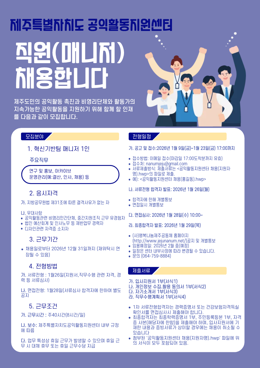 | 20634 | 제주특별자치도공익활동지원센터 직원(매니저)채용 | 3 | 문 ㅇㅇ | 2026-01-09 | 393 |