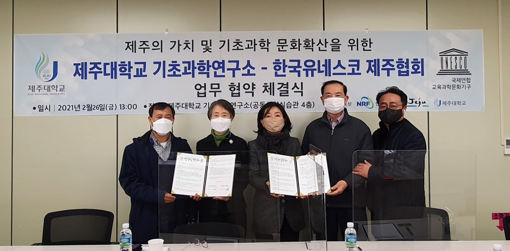Jeju National University's Institute of Basic Science (Director Kim Myung-sook) and the Jeju Association under the Korean National Commission for UNESCO (Chairman Lee Sun-hwa) announced on Tuesday (March 2) that they signed a business agreement at Jeju National University on Feb. 26.