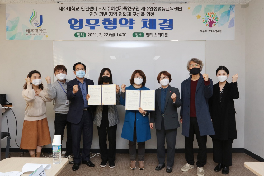 Jeju National University Human Rights Center (Yeom Mi Kyung, Director) has agreed to collaborate with Jeju Women Family Research Institute Jeju Gender Equity Education Center (Moon Soo Yeon, Director) for regional development based on the constitution of human rights body last Monday (February 22, 2021).