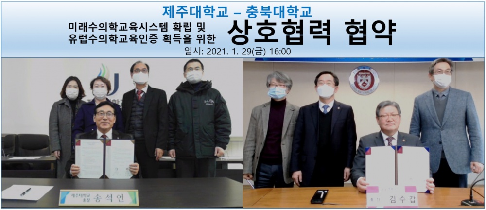 To implement the joint program of establishing the future veterinary medicine system and acquire the European Association of Establishments for Veterinary Education (EAEVE) certification, Jeju National University (Song Seok-Eon, President) and Chungbuk National University (Kim Soo Kap, President) signed the agreement at an online conference last Friday (January 29, 2021).
