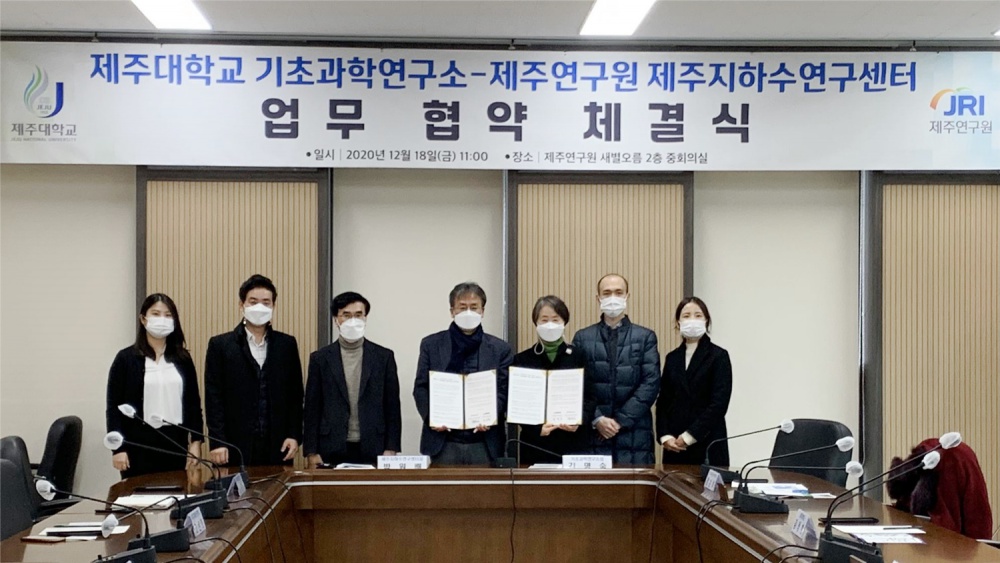 The Jeju National University Basic Science Institute (Kim Myung Sook, Director) has signed the agreement with Jeju Research Institute Underwater Research Center (Park Won Bae, Director) for collaborative natural environmental conservation/development of underwater management system last Friday (December 18, 2020).