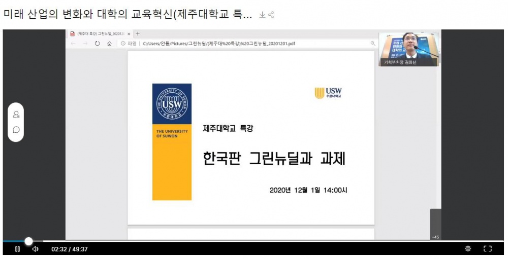 Jeju National University (Song Seok-Eon, President) hosted Professors Wi Jung Hyun, Joongang University and Kim Ji Hwan, Suwon University, digital and green technology experts, respectively, for invited talks under the thematic banner of “Changes in future industry and university education reform” last Tuesday (December 1, 2020).