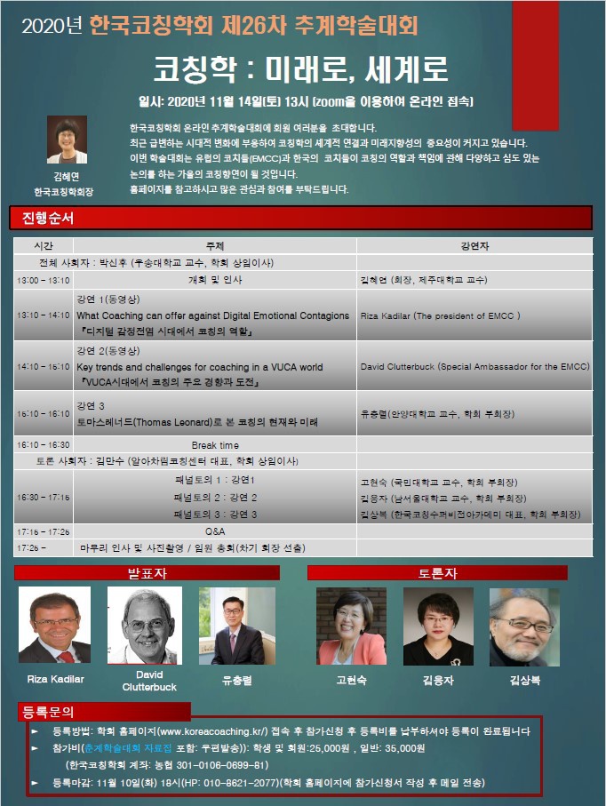 Korea Coaching Society (Kim Hye Yeon, President and JNU Professor) plans to have its 2020 Fall meeting of the society online starting November 14, 2020.