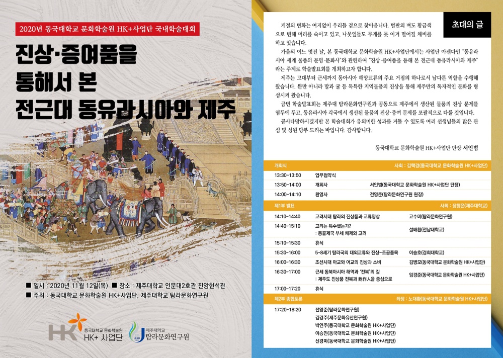 Jeju National University Tamla Culture Institute (Chun Young Joon, Director) hosts a scholastic conference entitled “Pre-modern East Eurasia and Jeju seen through offerings to the king/gifts in the College of Humanity Studies Hall#2 next Thursday (November 12, 2020). The conference is co-sponsored with Dongkuk University Cultural Institute and its HK+Project.