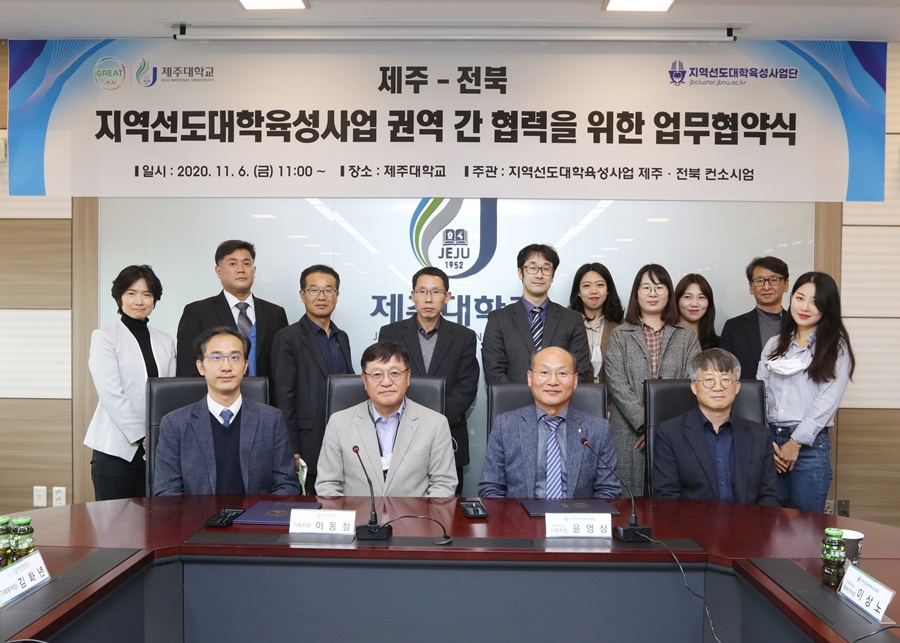 Jeju National University (Lee Dong Cheol, Vice President for Planning and Director) and Chonbuk National University (Yoon Young Sang, Vice President for Planning and Director) Regional Flagship University Development projects have signed the agreement for inter-regional collaborations in personnel, materials and facility sharing/exchange last week (November 6, 2020).