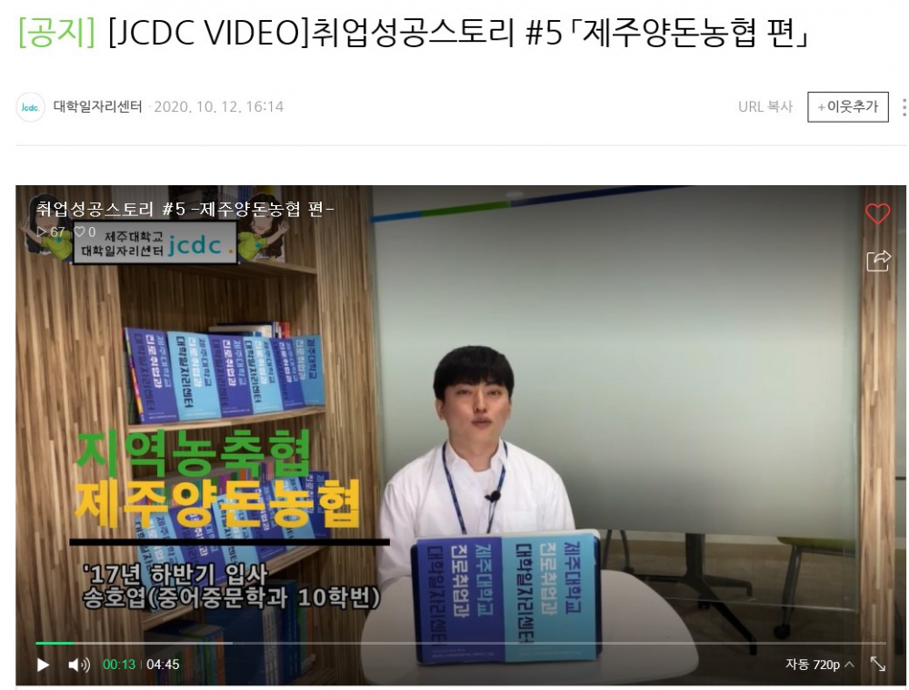The video is accessible via the blog (https://blog.naver.com/jnujob).
