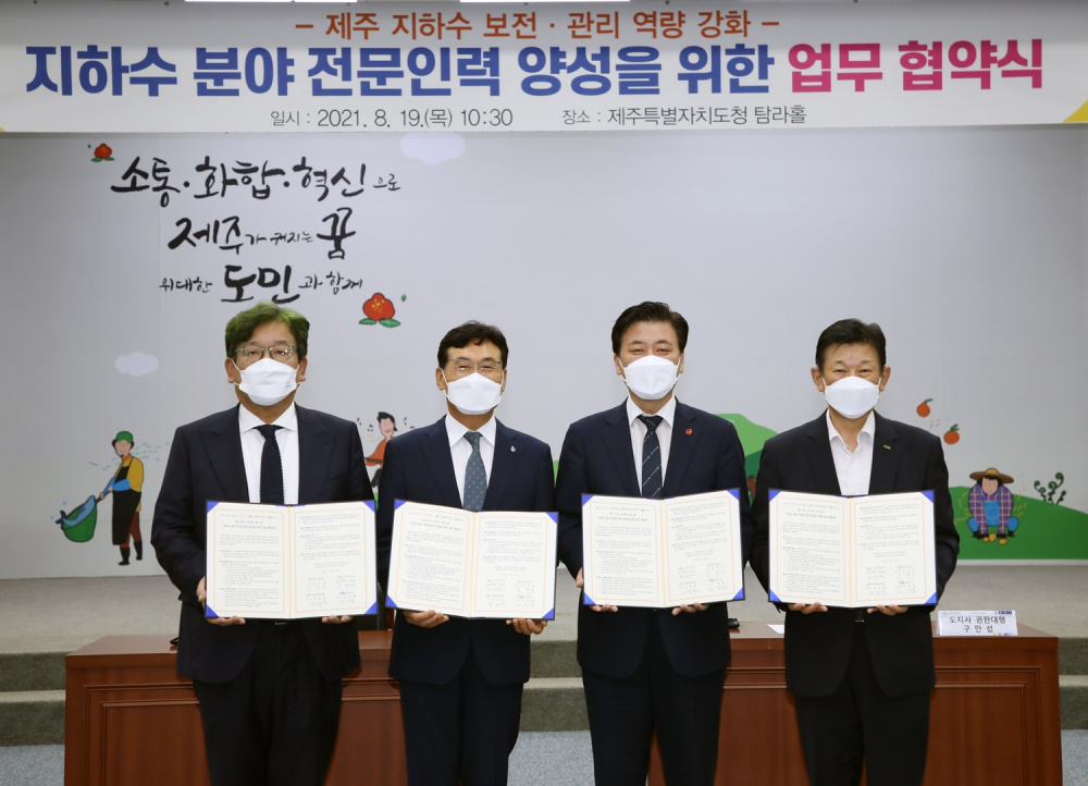 Jeju Special Self-Governing Province (JSSGP) met with Jeju National University (JNU), Jeju Provincial Development Corporation (JPDC), and Jeju Research Institute (JRI) early on Thursday (Aug. 19) to sign a memorandum of understanding on incubating groundwater management experts.
