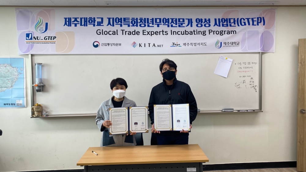 Jeju National University’s Global Trade Experts Incubating Program (JNU-GTEP) signed an agreement with Southeast Agricultural Corporation for industry-academy cooperation on improving export sales on Thursday (May 20).
