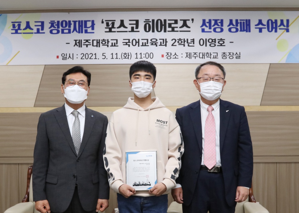 POSCO TJ Park Foundation presented the certificate of a POSCO Heroe to a second-year Jeju National University student who helped with the rescue operation after the recent car collision near Jeju National University, the university announced Tuesday (May 11).