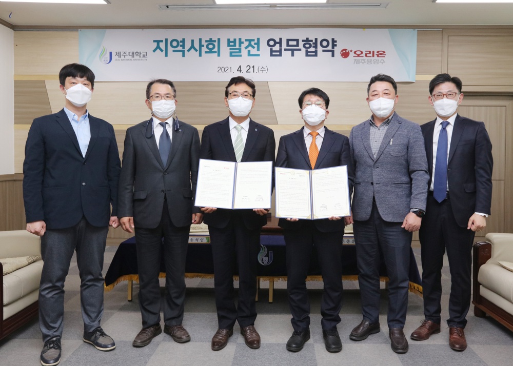 Jeju National University and Orion’s Jeju Yongamsu mineral water signed a memorandum of understanding for local community development, the university announced Wednesday (April 21).