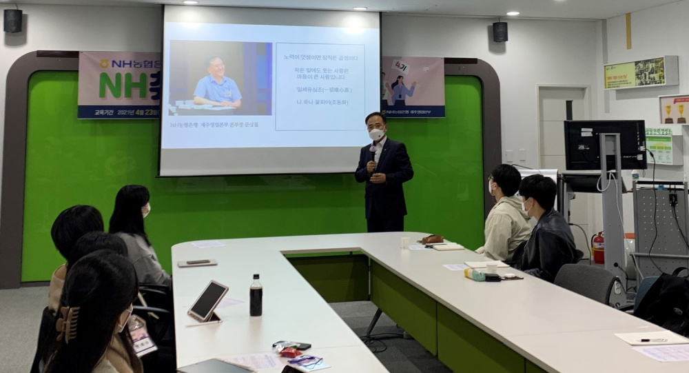 The career education program started featuring Moon Sang-cheol, head of the bank’s Jeju Business Headquarters who gave the students a lecture titled, “Reflecting on the 30 years of working for NH.” Following the opening lecture, Tae Yong-moon, director of the bank’s Cheongju Training Center, helped the students better understand cooperatives and agriculture. Previously in October last year, Jeju National University signed an agreement with NH Cheongju Training Center to foster talented financial specialists together.